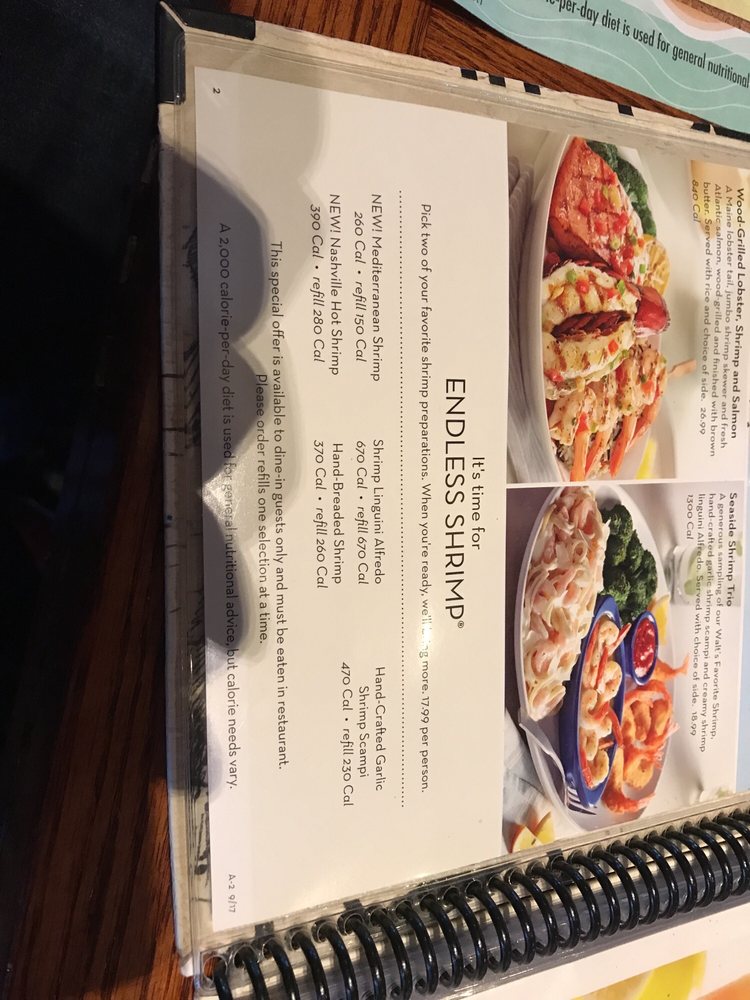 Walt's Favorite Shrimp (260 cal), Grilled Shrimp (250 cal), Garlic Shrimp Scampi (220 cal), Parrot Isle Jumbo Coconut Shrimp (470 cal), Shrimp Linguini Alfredo (620 cal)